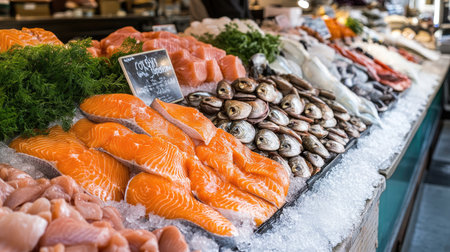 a fresh fish store with neatly arranged counters displaying seafood, including salmon, tuna, and shellfish, all kept cool on ice.