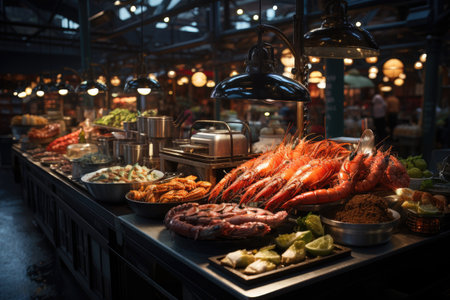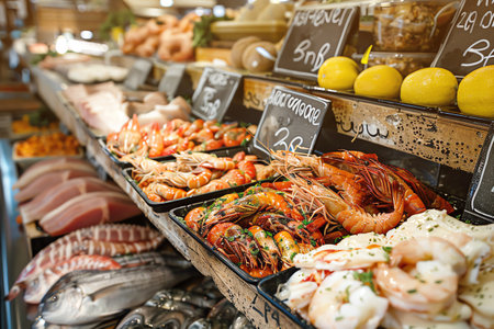Fresh Seafood Display Vibrant Fish Market Stall with Variety of Seafood and Shrimps in Foreground