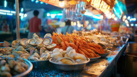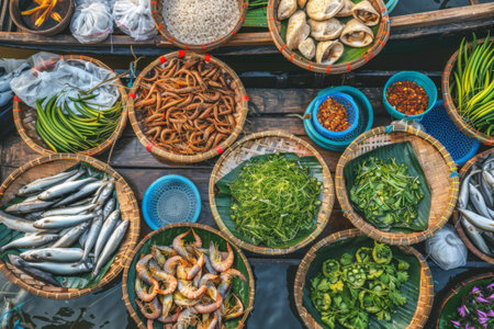 Explore a traditional market scene showcasing a colorful array of fresh seafood. The vibrant display highlights various fish and shellfish, emphasizing the rich textures and natural beauty of local culinary treasures.