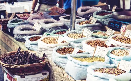 Catania, Sicily – august 16, 2018: dried fruits, spices and nuts in the fruit market, Catania, Sicily, Italy