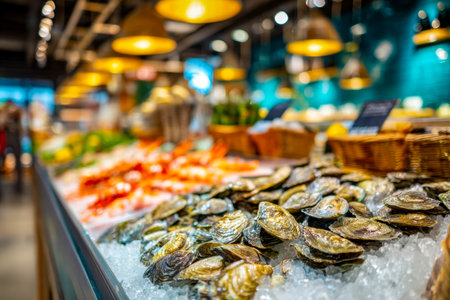 Vibrant assortment of glistening fish, shellfish, and crustaceans arranged on crushed ice amidst a lively market scene, inviting fresh catch enthusiasts.