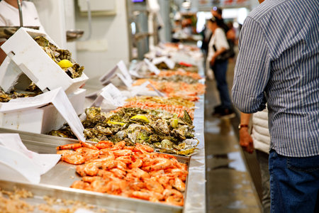 Vibrant seafood market scene showcasing fresh catches and lively atmosphere.