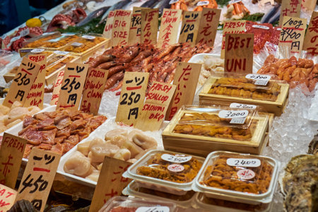 KYOTO, JAPAN - OCTOBER 19, 2019: Closeup view of different kind of Japanese fresh and fried seafood at the Kyoto market. Japan