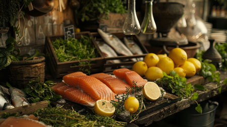 Fresh fishmonger stall with salmon fillets and shellfish, surrounded by herbs and lemons inside a rustic market
