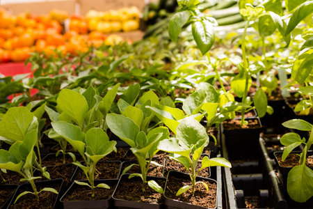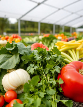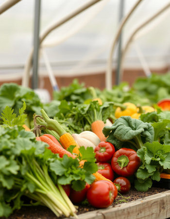 Fresh organic vegetables in a greenhouse. Selective focus on foreground.