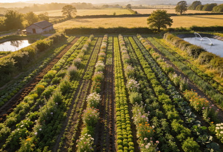 Aerial view of a small cottage surrounded by rows of lettuce plants