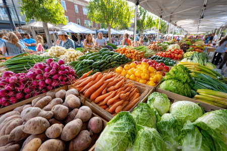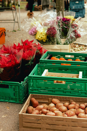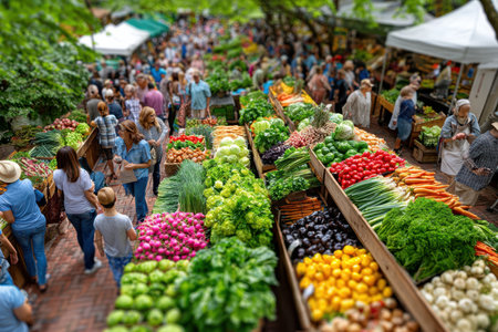 Lively farmers market bustling with shoppers exploring fresh produce and colorful flowers