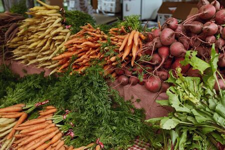 Boulder, Colorado - August 10th, 2019: Colorful display of carrots, beetroots and other vegetables for sale at a Farmers Market