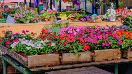 Selling of seedlings of flowers in farmers market. Flower stall.