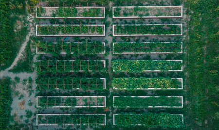 Separate boxes with agricultural crops. View from a drone. Growing plants
