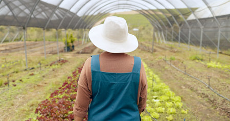 Greenhouse farming, agriculture and back of woman with sustainable business in nature for quality check. Industry, plant or behind female farmer outdoor with greenery, leaf or agro growth inspection