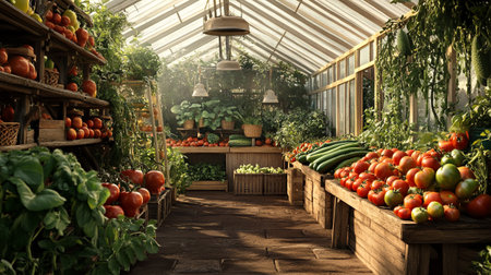 Tomatoes, cucumbers and other vegetables in the greenhouse. 3d rendering