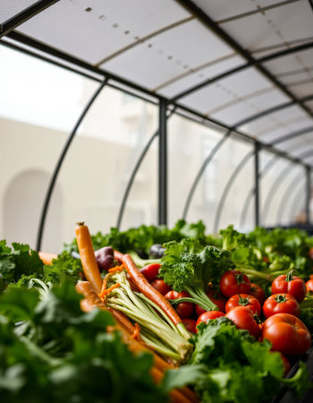 Assortment of fresh vegetables in a greenhouse setting, showcasing carrots, zucchini, tomatoes, and lettuce.
