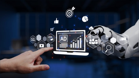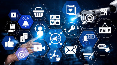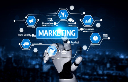 A futuristic robotic hand reaches out to engage with digital marketing icons, highlighting essential elements like consumer engagement, branding, and promotion strategies today. Tessel