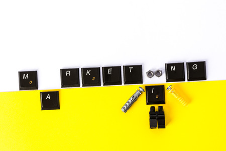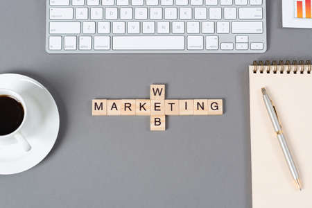 Web marketing concept with letters on cubes. Still life of office workplace with crossword. Flat lay grey surface with pc keyboard and cup of coffee. New strategy planning and workflow optimization.
