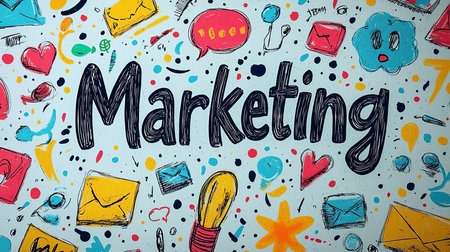 Colorful illustration of marketing concept featuring hand drawn doodles and lettering. Perfect for conveying creativity, strategy, and communication ideas.