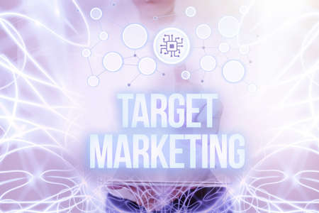 Sign displaying Target Marketing. Business concept group of potential customers that will buy the product Lady Holding Tablet Pressing On Virtual Button Showing Futuristic Tech.