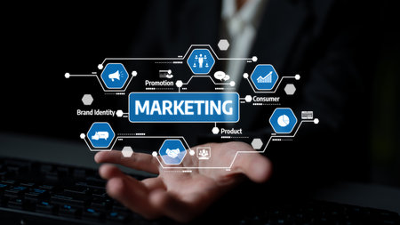A creative representation of modern marketing strategies focusing on brand identity and consumer engagement, highlighting technology role in promotion and product success. Tessel