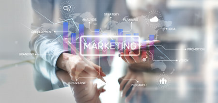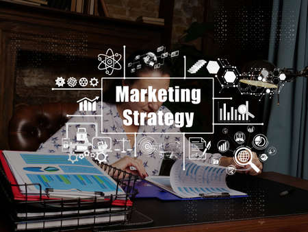 Marketing strategy concept on virtual screen. Internet, advertising and digital technology concept. Sales growth.