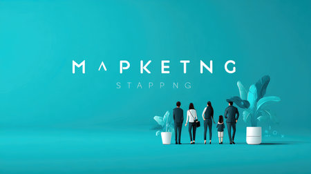 A modern depiction of a diverse group of individuals standing together against a light blue background, showcasing themes of unity, collaboration, and innovative marketing concepts.