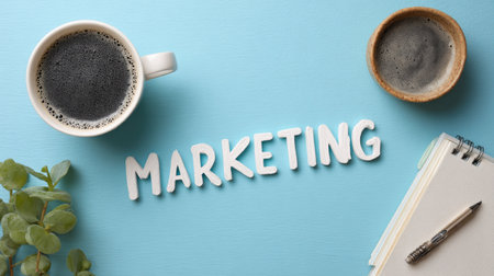 A creative workspace featuring the word marketing made from letters, surrounded by a cup of coffee, notepad, pen, and a decorative plant on a blue background.
