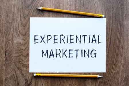 The text EXPERIMENTAL MARKETING is written in a notebook which lies on a wooden table. Lettering on a business or financial theme. business concept.