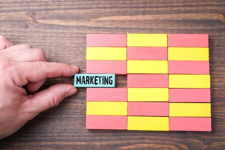 A straightforward yet powerful image suitable for use in business presentations, marketing materials, or blog posts related to branding, advertising, and commerce | This image features the word MARKETING spelled out in bold, capital letters on wooden blocks, set against a solid, vibrant blue background. The minimalist design emphasizes clarity and focus, with the natural texture and grain of the wood juxtaposing the smoothness of the backdrop. The choice of a monochromatic blue color scheme evokes feelings of trust, intelligence, and communication, which are key elements in successful marketing strategies. The wooden blocks suggest building blocks, symbolizing the foundational and strategic aspects of marketing that companies use to construct their brand identity and market presence. The simplicity of the setup allows for direct conveyance of the image's core message, highlighting the essence of marketing in the business world | Ideal for educational content emphasizing the basics of marketing principles, as a visual accent in presentations that focus on the structure and building blocks of effective advertising, or as a cover image for marketing toolkits and guides. It also works well as a background for inspirational quotes about business growth, creativity in advertising, and the importance of a solid marketing plan | a clean and effective visual metonym for the concept of marketing, featuring wooden letter blocks spelling out 'MARKETING' on a singular blue background, offering a stark contrast and room for text or additional graphics