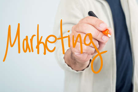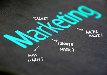 Marketing, and kind of business word printed on the paper, scattered on the table with pen and smart phone, marketing topic and concept