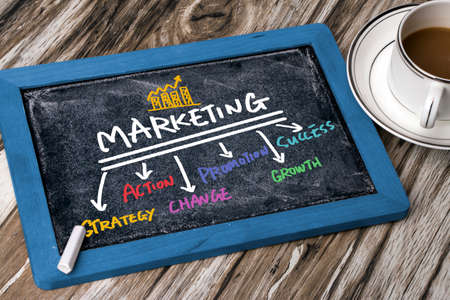 A serene workspace featuring a chalkboard with Marketing, a coffee mug, a notepad, and a green plant, perfect for creativity and inspiration.