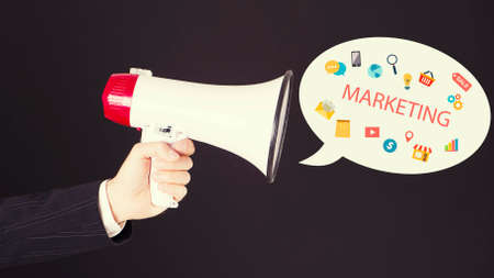 Word writing text Marketing 2020. Business photo showcasing Commercial trends for 2020 New Year promotional event Empty Speech Bubble covers half of the Photo Megaphone make an announcement