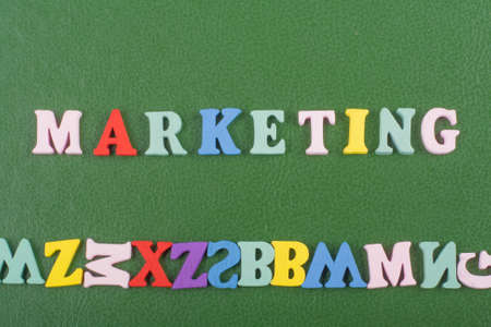 MARKETING word on green background composed from colorful abc alphabet block wooden letters, copy space for ad text. Learning english concept.