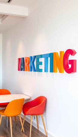 Red and orange chairs in a corprate with the word MARKETING