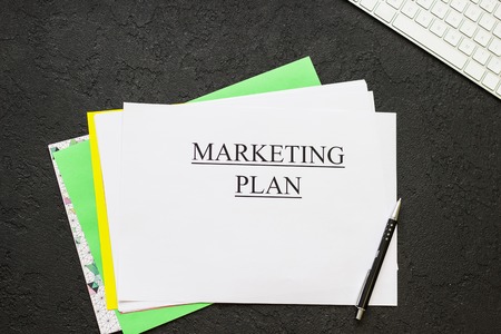 Marketing plan inscription on a white paper, a pen and a keyboard on a black concrete background.