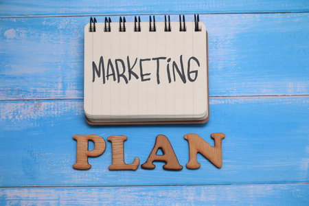 Marketing Plan, text words typography written on wooden background, life and business motivational inspirational concept