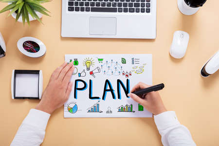 Goal, Plan, Challenge and Strategy Concept. Person making Business Plan on Sticky Note. Closeup and Selective Focus