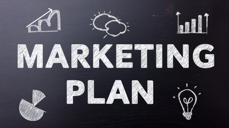 This creative image features a marketing plan concept with hand-drawn elements on a chalkboard background. It showcases strategic concepts and progress indicators that enhance visual learning.