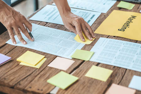 Two creative Business people meeting and planning use post it notes sticky note on board to share idea, Analysis data charts and graph with teamwork strategy brainstorming.