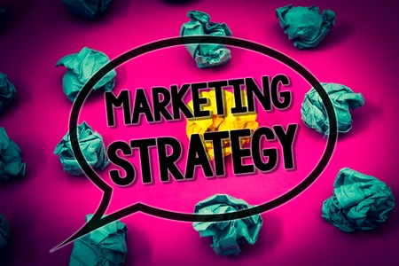 Text MARKETING STRATEGY written on orange note with strategy symbols. Business concept
