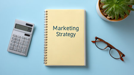 A flat lay image featuring a yellow notebook titled Marketing Strategy, a calculator, stylish glasses, and a small green plant on a blue surface.