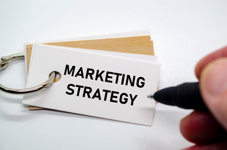 Strategic marketing plan text shown on white notepad for brand growth and audience reach.