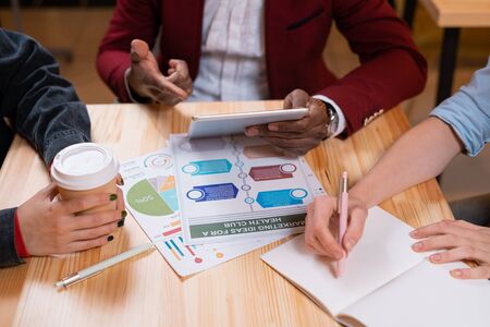 work meeting A group of corporate employees kicked off an interesting new project and brainstormed at their desks with colorful notes teams discussing ideas.