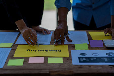 Close up of professional business team hands writing and putting sticky note on scrum task board. Top view of project manager write task and use kanban board to manage time and workflow. Directorate.