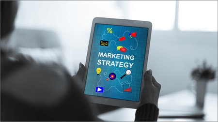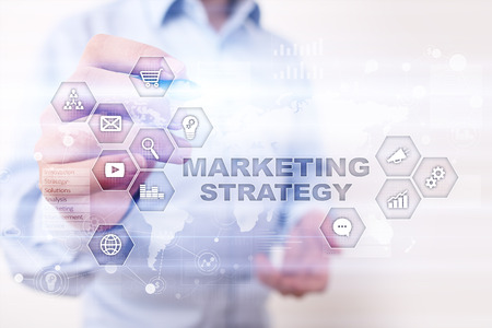 Marketing strategy concept on virtual screen. Internet, advertising and digital technology concept. Sales growth.