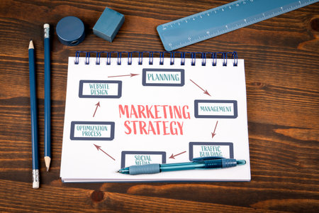 Marketing Strategy Diagram on Notebook with Office Supplies