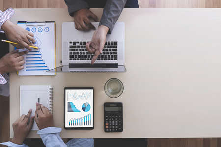 group of colleagues young business people in smart casual working and brainstorm planning new project on desk in meeting room at modern office, digital marketing, business meeting startup concept