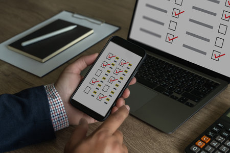 Close-up of a businessman's hand filling online survey form on laptop in office