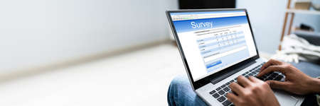 Close-up Of A Businessperson's Hand Filling Online Survey Form On Laptop