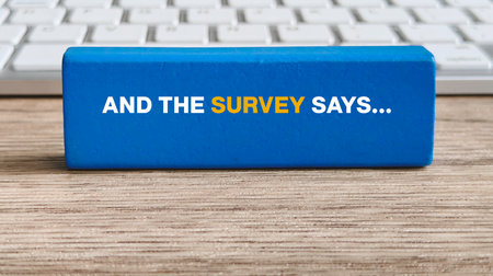 And The Survey Says... Text on Blue Wooden Block with Keyboard Background for Research and Feedback Concept
