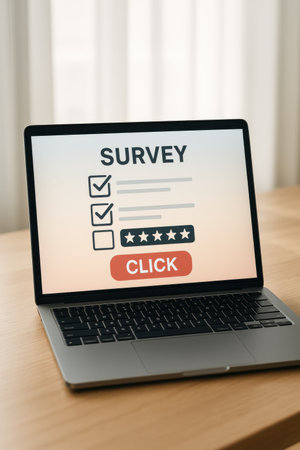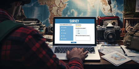 Survey form on laptop screen with checkboxes and star rating for feedback