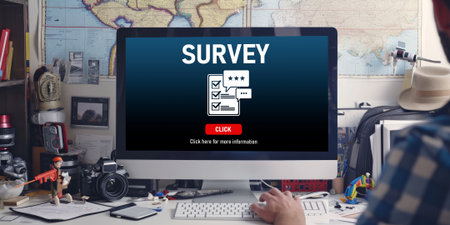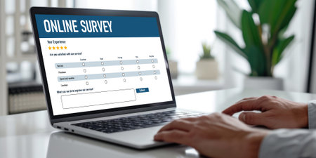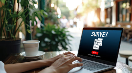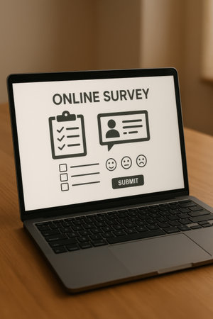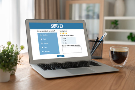 Online survey form on laptop screen with icons and submit button for feedback collection